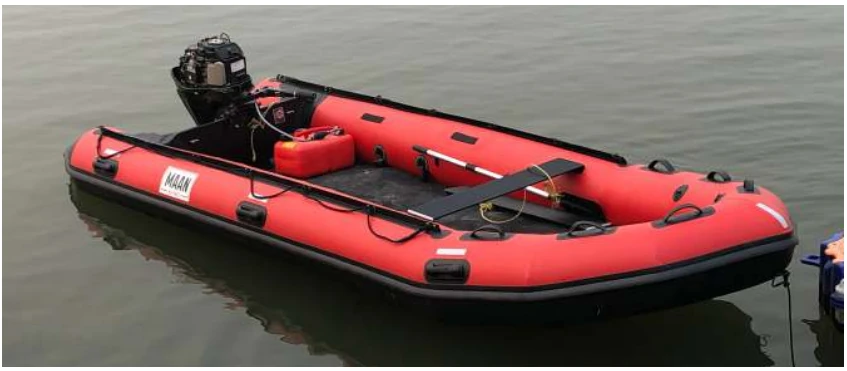 Maan Inflatable Rescue Raft is a versatile product that can be used with 30 hp short shaft outboard motors. The raft has an inflatable, rigid, stable and comfortable floor board. The raft also has a twin inflatable keel design for better performance and stability. It can be towed, line-controlled or paddled without a motor. The raft is light, compact and easy to transport and store. It has a fender guard and a rubbing guard for protection. The raft can be inflated by different methods.